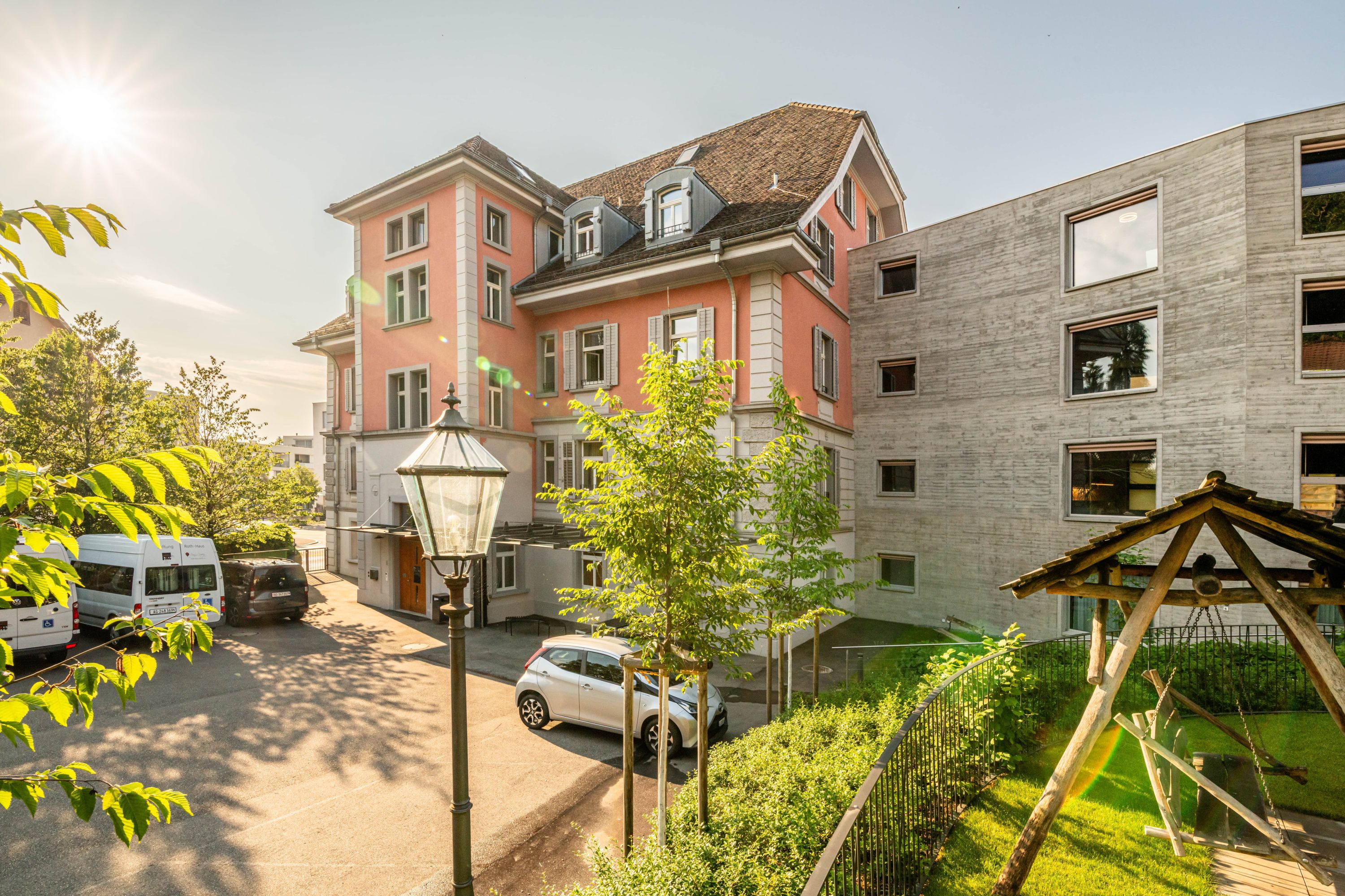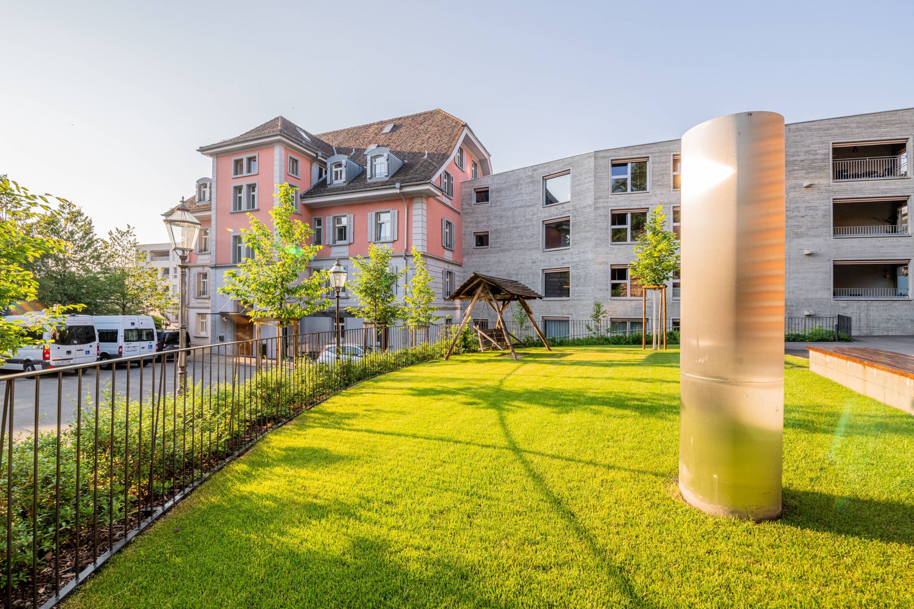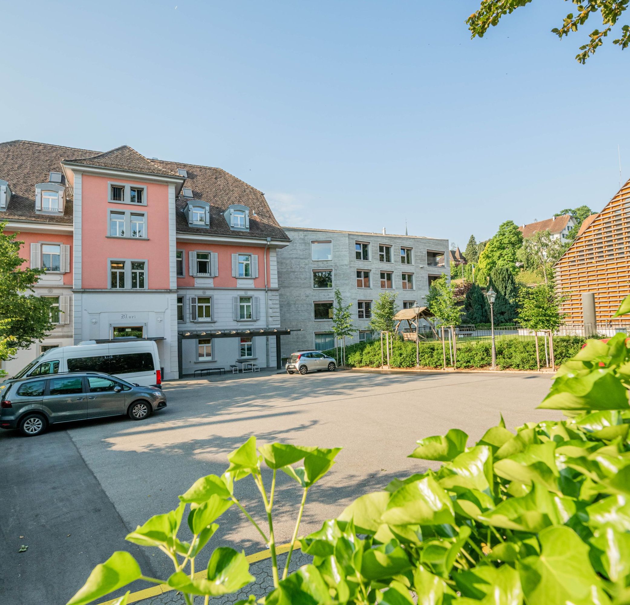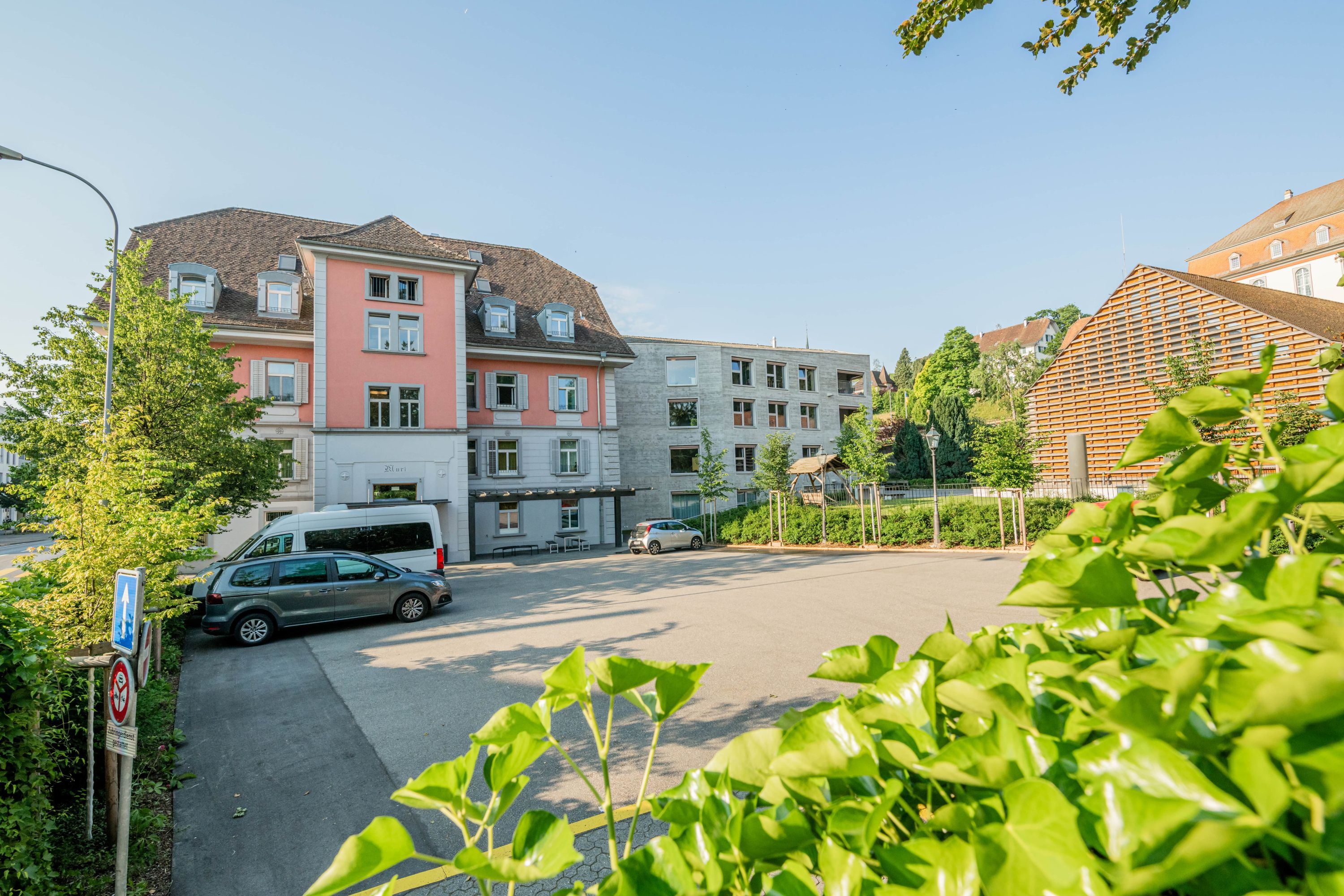 Das Gebäude fügt sich sehr gelungen in die historische Umgebung ein. Es liegt ideal im Zentrum der Gemeinde. Somit sind Geschäfte, Restaurants, Ärzte, Dienstleistungen und der öffentliche Verkehr in kurzer Distanz erreichbar. Der direkt angrenzende Klosterpark mit seinem alten Baumbestand prägt die tolle Aussicht aus dem Gebäude. Damit sorgt der harmonische Mix des Gebäudes aus Zentrumsnähe und Naherholung für eine familiäre Atmosphäre mit hoher Wohnqualität.