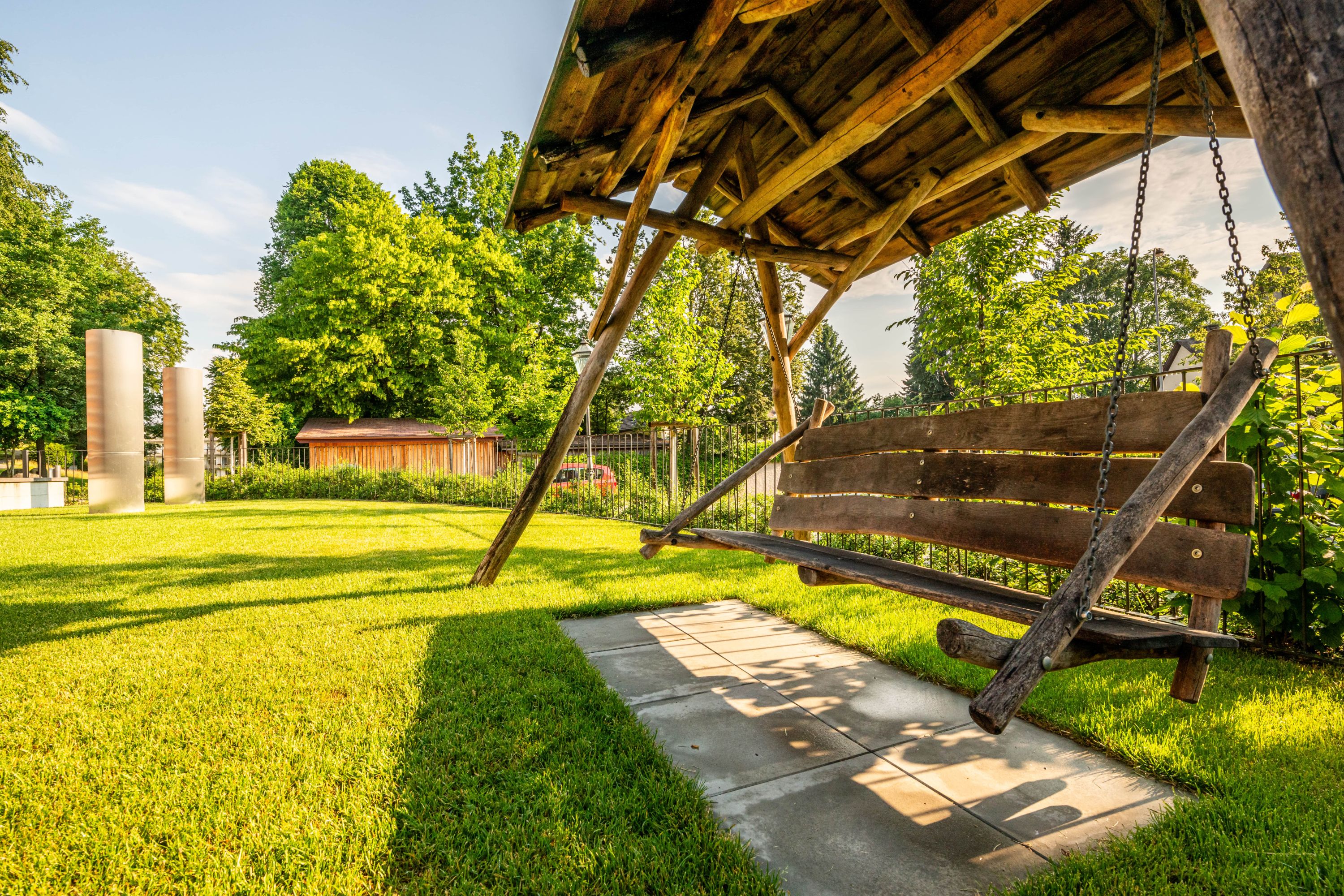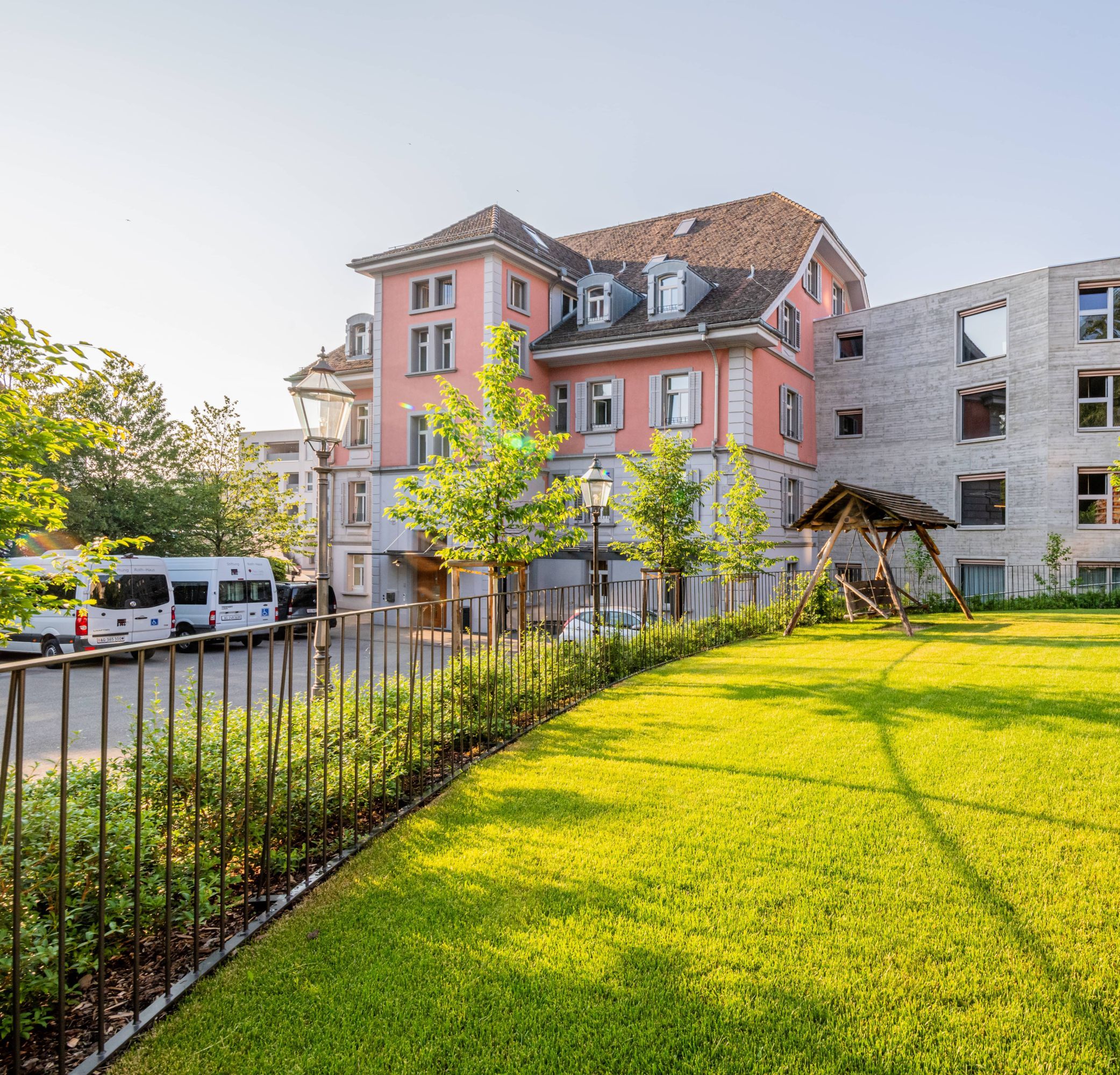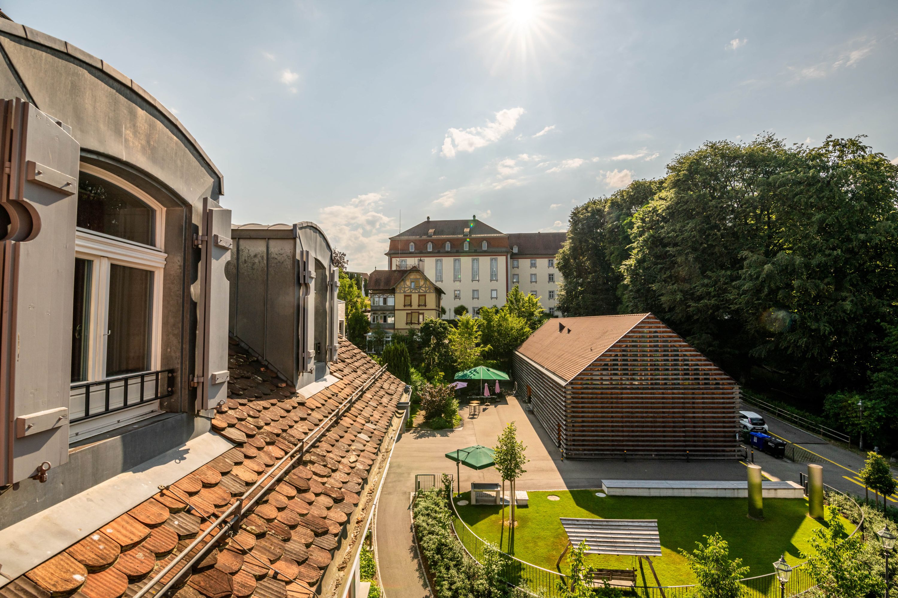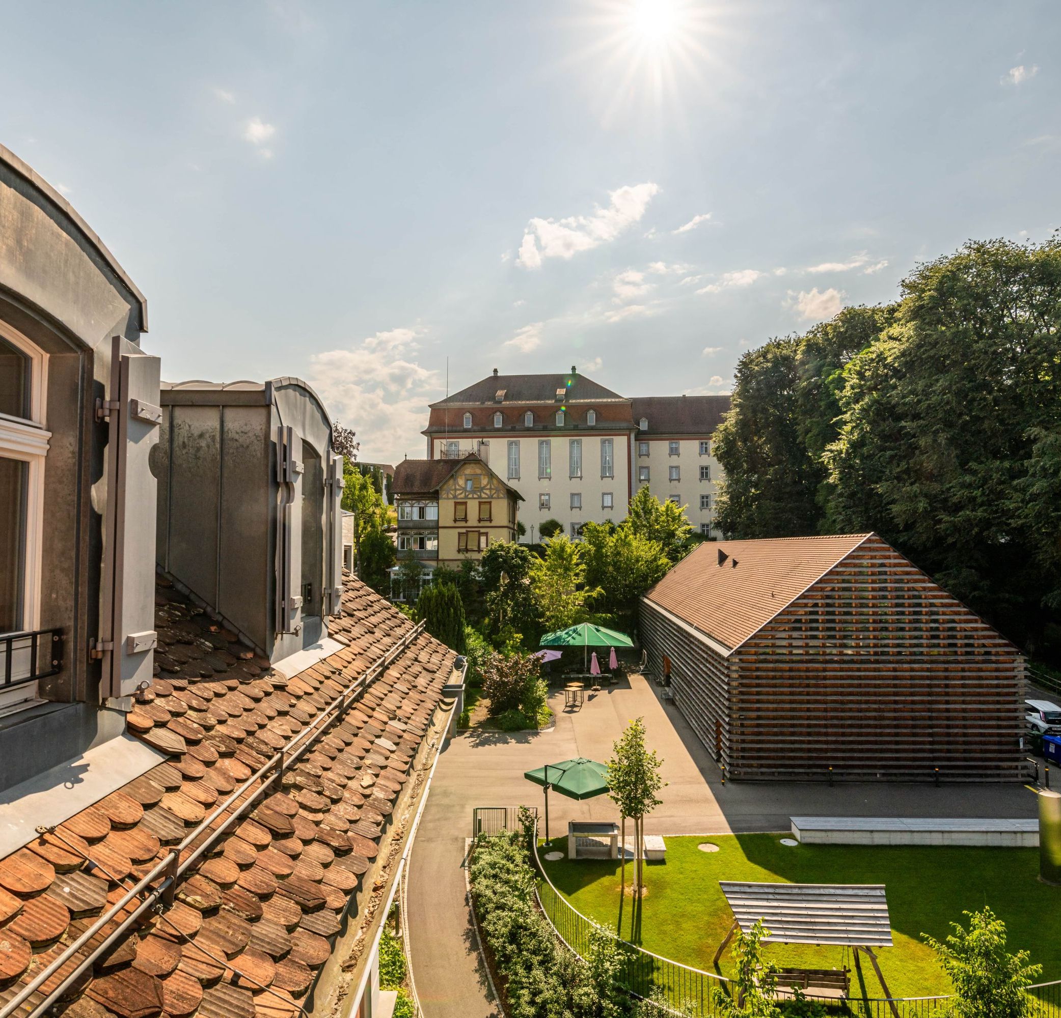 Das Gebäude fügt sich sehr gelungen in die historische Umgebung ein. Es liegt ideal im Zentrum der Gemeinde. Somit sind Geschäfte, Restaurants, Ärzte, Dienstleistungen und der öffentliche Verkehr in kurzer Distanz erreichbar. Der direkt angrenzende Klosterpark mit seinem alten Baumbestand prägt die tolle Aussicht aus dem Gebäude. Damit sorgt der harmonische Mix des Gebäudes aus Zentrumsnähe und Naherholung für eine familiäre Atmosphäre mit hoher Wohnqualität.