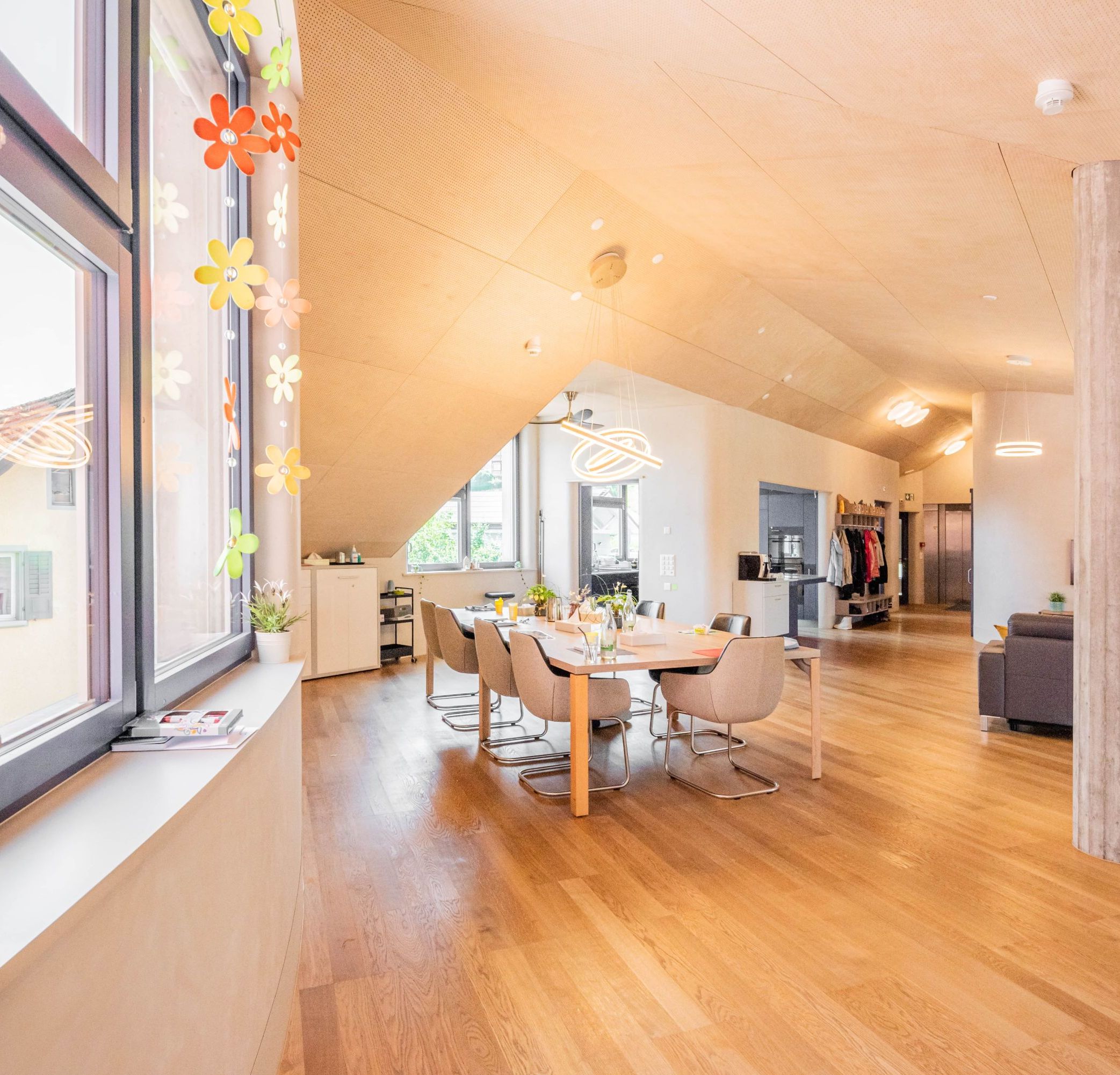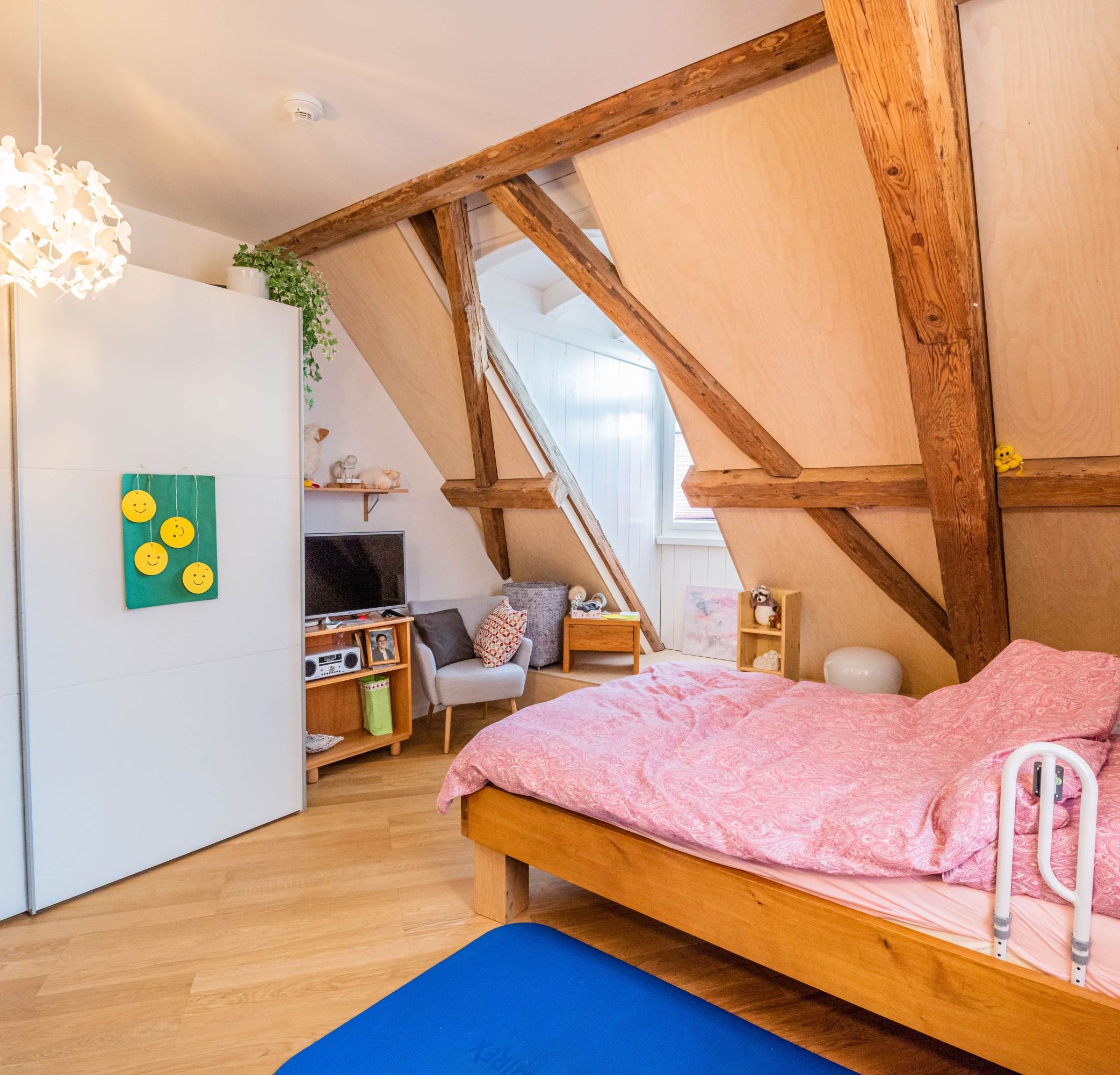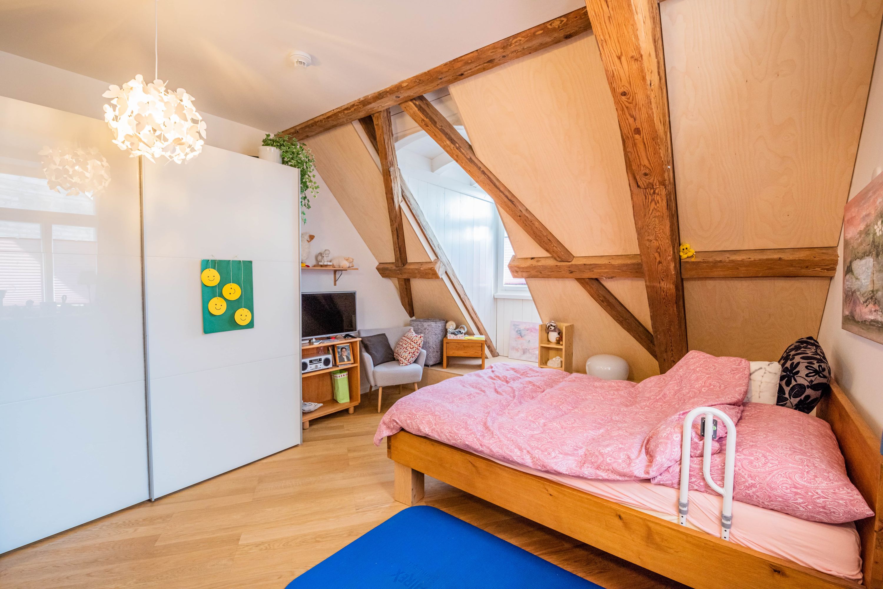 Das Wohnhaus besteht aus dem historischen, über 300-jährigen Roth-Haus und einem modernen, 2021 erstellten Anbau. Der Übergang vom Altbau zum Anbau ist aussen wie innen fliessend und wirkt sehr harmonisch. So trägt die einzigartige Architektur zu einem grossen Wohlfühlcharakter bei und lässt die Bewohnenden ein tolles Raumgefühl geniessen.