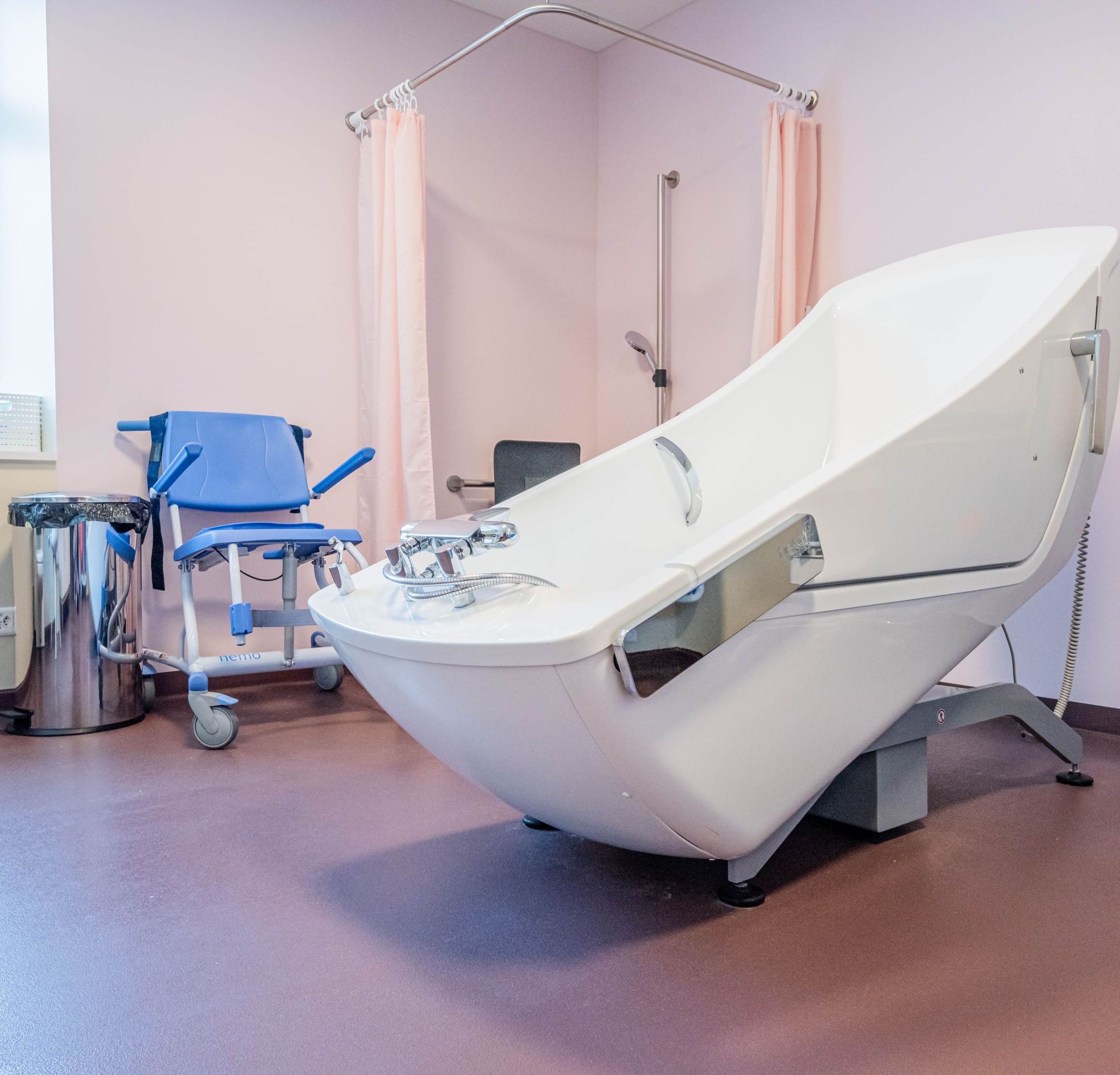 Als eindrückliche Wohlfühloase, stilvoll und funktional, präsentiert sich auch das Bad. Es verfügt unter anderem über eine moderne Sitz- Liege- und Sprudelbadewanne sowie über ein höhenverstellbares WC.