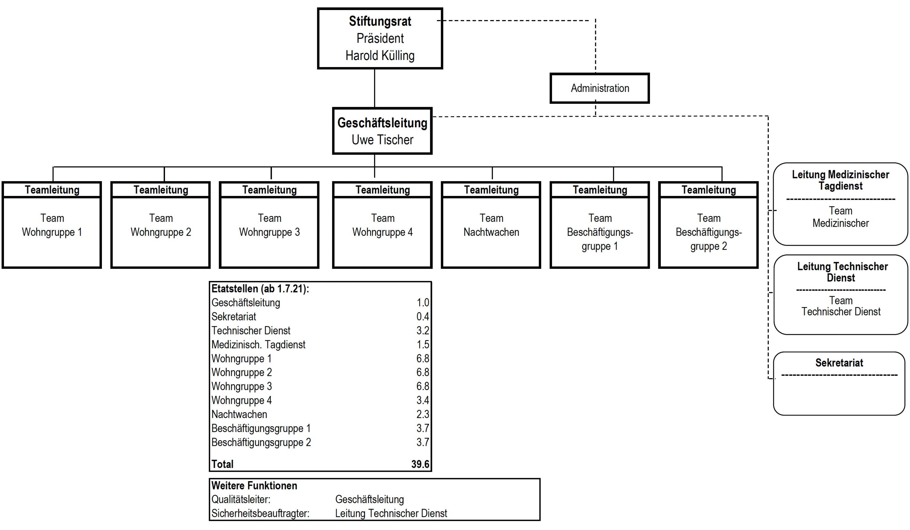 Die internen Bereiche und Teams sind: Der medizinische Tagdienst, der technische Dienst und das Sekretariat. Der medizinische Tagdienst ist für den medizinischen Bereich und die Sicherstellung einer fachgerechten Pflege der Klientinnen und Klienten verantwortlich. Der technische Dienst ist zuständig für die Überwachung der technischen Anlagen, die Wartung und Sauberkeit der Gebäude, der Räume und der Aussenanlage sowie für Transportaufgaben. Das Sekretariat unterstützt die Geschäftsleitung bei administrativen Aufgaben.